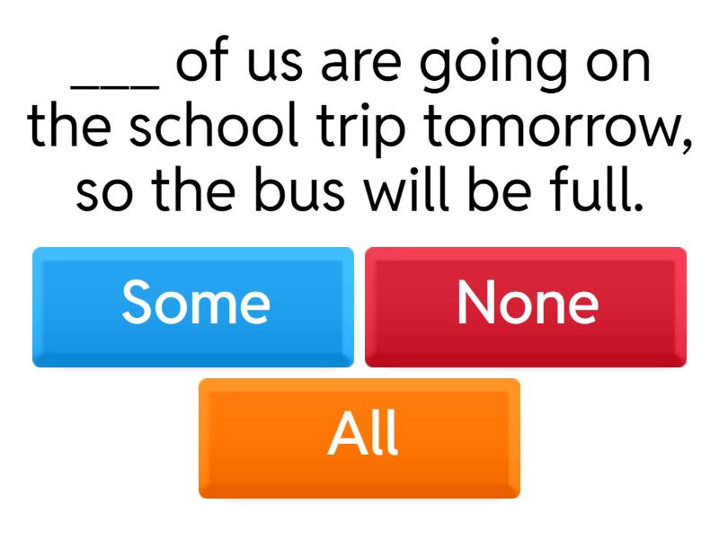 1) ___ of us are going on the school trip tomorrow, so the bus will be full. a) Some b) None c) All 2) I invited 10 people, but ___ of them came. The room was empty. a) All b) None c) Two 3) ___ of my classmates like football, but a few prefer basketball. That’s why most of the class plays every weekend. a) None b) Most c) All 4) We have many teachers. ___ of our teachers speak English very well, so we can practise every day. a) One b) None c) Lots 5) The teacher gave difficult homework, but ___ of the students didn’t understand it. The rest found it easy. a) Some b) All c) Most 6) I have two close friends. ___ of them live in the same city as me, because there are only two and they both stayed here. a) Some b) None c) Both 7) She has three sisters. ___ of them is a doctor, the other two are teachers. a) All b) None c) One 8) We were really tired after the trip. We’re ___ exhausted, not just one or two people. a) Some b) Most c) All 9) They are engineers. They’re ___ from Portugal, not just one of them. a) Some b) Both c) All 10) My parents are great cooks. ___ of them prepare delicious food, so dinner is always tasty at home. a) None b) Lots c) Both 11) I lost my keys. Only ___ is in my bag, the others are missing. a) All b) One c) None 12) The question is easy. ___ of you know the answer, but nobody wants to say it aloud. a) None b) Both c) Most 13) The party was fantastic. ___ of the people were dancing and singing, the music was very loud. a) None b) Lots c) Some 14) Students usually don’t like exams. ___ hate them, but there are a few who don’t mind. a) Most students b) Most of students ❌ c) All students 15) We play football together every weekend. We’re ___ interested in sports, not just one or two. a) Some b) None c) All 16) Kate has many friends. She spends her free time with ___, especially on weekends. a) Both of them b) None of them c) Some of her friends 17) There were five phones on the table, but now ___ is missing. The others are still there. a) All of the phones b) One of the phones c) None of the phones