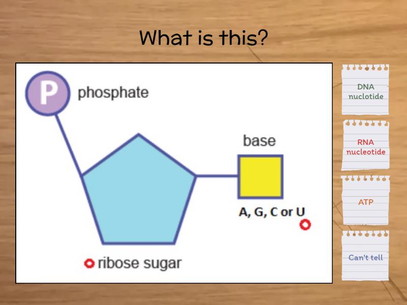 1) Feature of the genetic code which means that one amino acid can be coded for by more than one codon. a) universal b) non-overlapping c) degenerate d) triplet code 2) Feature of the genetic code meaning that codons code for the same amino acids in different species a) universal b) non-overlapping c) degenerate d) triplet code 3) What is this? a) DNA nuclotide b) RNA nucleotide c) ATP d) Can't tell 4) Which type of bond is between two adjacent nucleotides in DNA a) Ester b) Phosphoester c) Phosphodiester d) ATP 5) What is a codon? a) a DNA base triplet b) an mRNA base triplet c) a tRNA base triplet 6) What is a gene? a) A sequence of amino acids that codes for a polypeptide or functional RNA b) A DNA code for characteristics c) A sequence of bases that codes for a functional RNA or the sequence of amino acids in a polypeptide d) A base sequence that determines the order of nucleotides