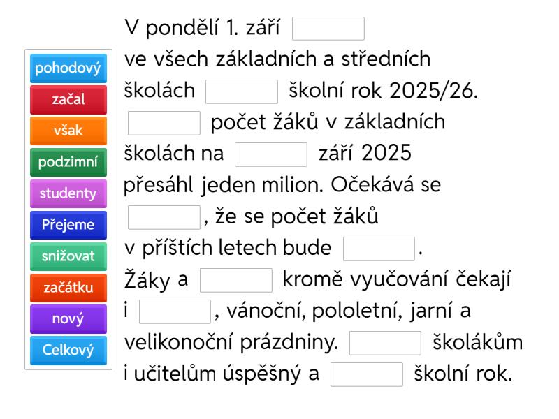 V pondělí 1. září ____ ve všech základních a středních školách ____ školní rok 2025/26. ____ počet žáků v základních školách na ____ září 2025 přesáhl jeden milion. Očekává se ____, že se počet žáků v příštích letech bude ____. Žáky a ____ kromě vyučování čekají i ____, vánoční, pololetní, jarní a velikonoční prázdniny. ____ školákům i učitelům úspěšný a ____ školní rok.