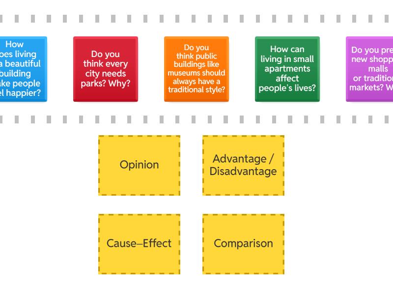 Opinion: Do cities need to have beautiful buildings? Why?, Do you think public buildings like museums should always have a traditional style?, Do you think modern architecture is attractive?, Do you think skyscrapers make a city more attractive? Why or why not?, Do you think every city needs parks? Why?, Advantage / Disadvantage: What are the advantages of taking care of traditional buildings?, What are the disadvantages of living in a tall building?, What are the advantages of living in the city?, Cause–Effect : How does living in a beautiful building make people feel happier? , How can living in small apartments affect people’s lives? , How can noisy buildings affect people’s health? , How can public buildings like libraries change a community?, Does the design of a school affect how students learn? How? , Comparison: Which is more important, the design or the function of a building? Why? , Which is better to live in: an apartment or a house? Why? , Do you prefer new shopping malls or traditional markets? Why? ,