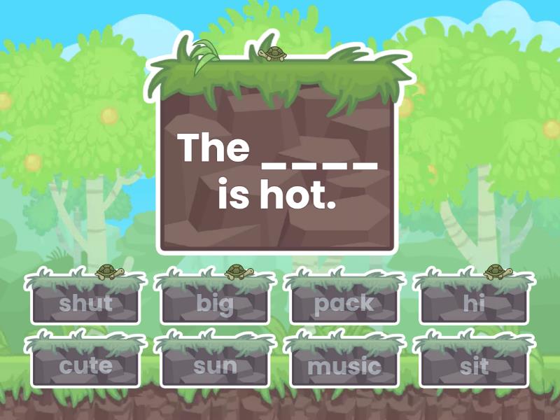 sun - The ____ is hot., shut - I ____ the box., music - I like to listen to _____., sit - She will ____ up., big - The bug is ____!, hi - I said "__" to my dog., pack - I ____ my lunch., cute - The puppy is ____.,