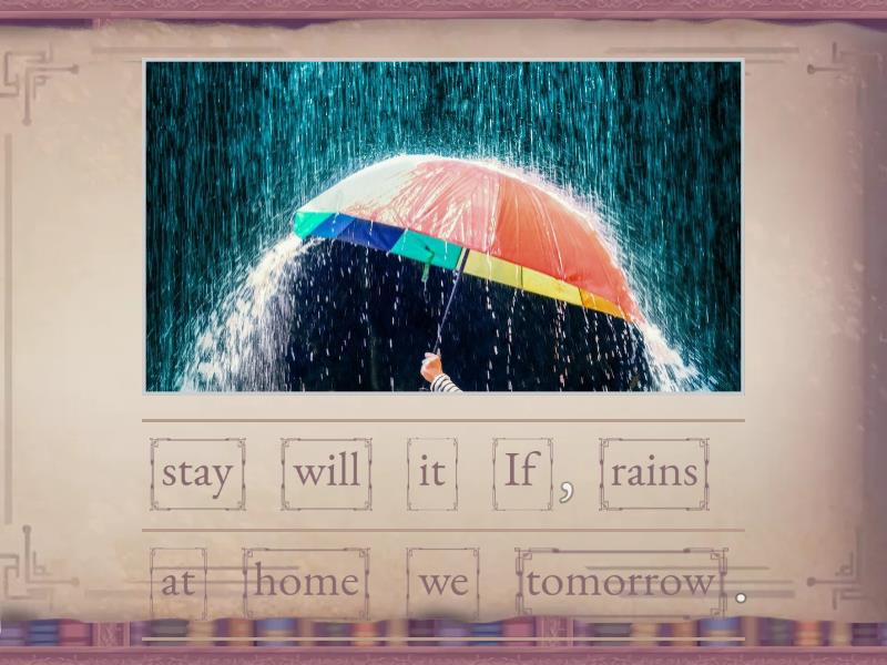 If it rains tomorrow, we will stay at home., If he studies hard, he will pass the exam., If they arrive early, we will have dinner together., If he doesn't call, she will be upset., If we work together, we will finish faster., If you eat too much food, you will feel sick.,
