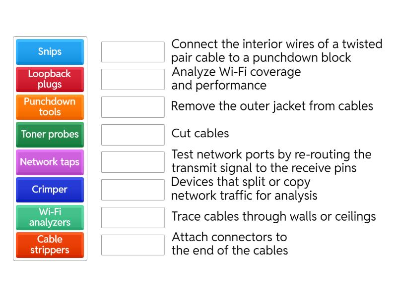 Snips - Cut cables, Cable strippers - Remove the outer jacket from cables, Crimper - Attach connectors to the end of the cables, Punchdown tools - Connect the interior wires of a twisted pair cable to a punchdown block, Toner probes - Trace cables through walls or ceilings, Loopback plugs - Test network ports by re-routing the transmit signal to the receive pins, Network taps - Devices that split or copy network traffic for analysis, Wi-Fi analyzers - Analyze Wi-Fi coverage and performance,