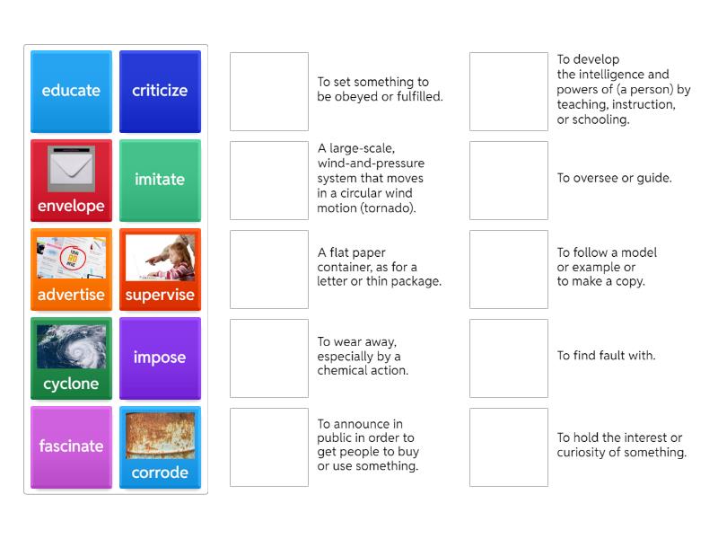 educate - To develop the intelligence and powers of (a person) by teaching, instruction, or schooling., fascinate - To hold the interest or curiosity of something., imitate - To follow a model or example or to make a copy., advertise - To announce in public in order to get people to buy or use something., supervise - To oversee or guide., criticize - To find fault with., impose - To set something to be obeyed or fulfilled., corrode - To wear away, especially by a chemical action., cyclone - A large-scale, wind-and-pressure system that moves in a circular wind motion (tornado)., envelope - A flat paper container, as for a letter or thin package.,