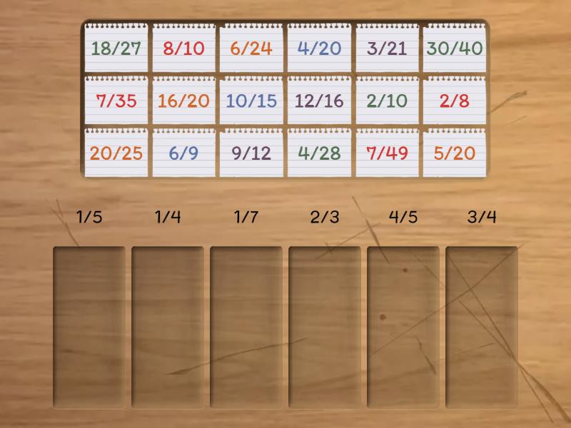 1/5: 2/10, 4/20, 7/35, 1/4: 2/8, 5/20, 6/24, 1/7: 3/21, 4/28, 7/49, 2/3: 6/9, 10/15, 18/27, 4/5: 16/20, 8/10, 20/25, 3/4: 12/16, 9/12, 30/40,