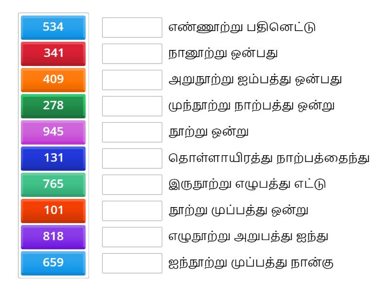 101 - நூற்று ஒன்று, 131 - நூற்று முப்பத்து ஒன்று, 278 - இருநூற்று எழுபத்து எட்டு, 534 - ஐந்நூற்று முப்பத்து நான்கு, 409 - நானூற்று ஒன்பது, 659 - அறுநூற்று ஐம்பத்து ஒன்பது, 341 - முந்நூற்று நாற்பத்து ஒன்று, 765 - எழுநூற்று அறுபத்து ஐந்து, 945 - தொள்ளாயிரத்து நாற்பத்தைந்து, 818 - எண்ணூற்று பதினெட்டு,
