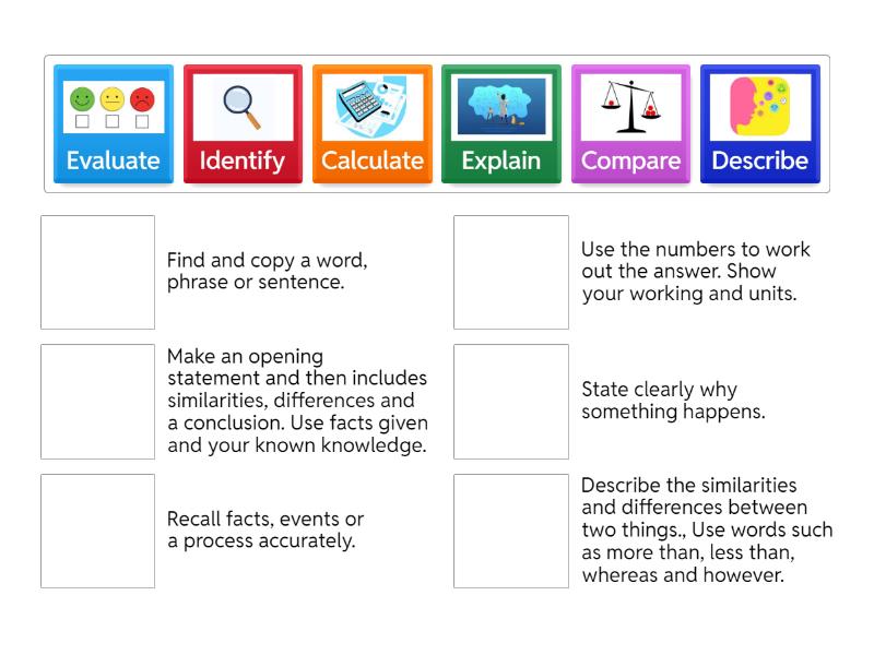 Explain - State clearly why something happens., Identify - Find and copy a word, phrase or sentence., Evaluate - Make an opening statement and then includes similarities, differences and a conclusion. Use facts given and your known knowledge., Compare - Describe the similarities and differences between two things., Use words such as more than, less than, whereas and however., Describe - Recall facts, events or a process accurately., Calculate - Use the numbers to work out the answer. Show your working and units.,