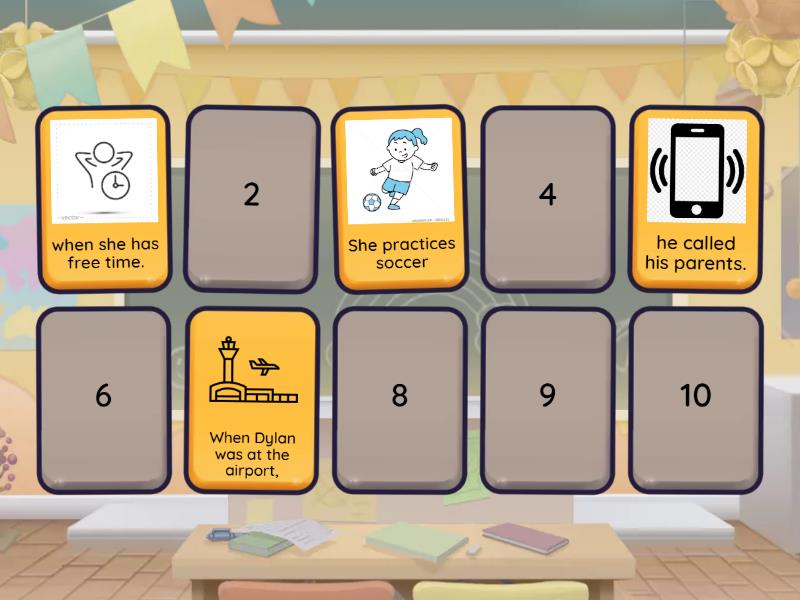 She practices soccer - when she has free time., When Dylan was at the airport, - he called his parents., Carol listens to music - when she reads books., When the weather is hot, - the kids eat ice cream., Before Miss Turner went to work, - she bought a sandwich,
