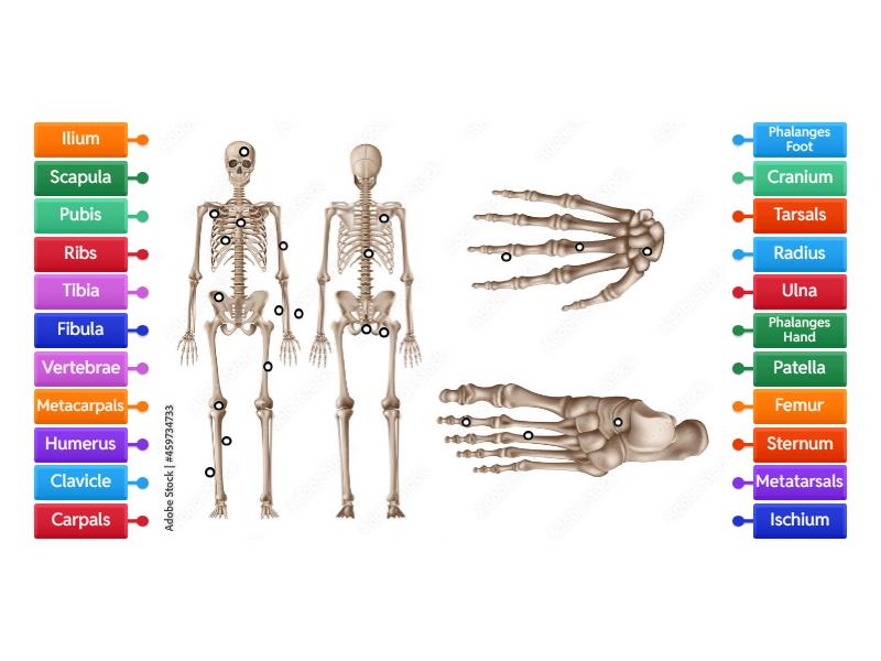 Clavicle, Ribs, Ilium, Patella, Tibia, Fibula, Cranium, Sternum, Humerus, Radius, Ulna, Femur, Scapula, Vertebrae, Ischium, Pubis, Tarsals, Metatarsals, Phalanges Foot, Carpals, Metacarpals, Phalanges Hand.