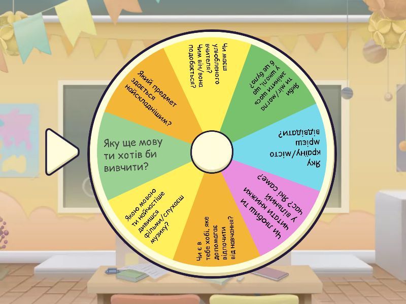 1) Який предмет здається найскладнішим? 2) Чи маєш улюбленого вчителя? Чим він/вона подобається? 3) Якби ти міг/могла змінити щось у школі, що б це було? 4) Яку країну/місто мрієш відвідати? 5) Чи любиш ти читати книжки у вільний час? Які саме? 6) Чи є в тебе хобі, яке допомагає відпочити від навчання? 7) Якою мовою ти найчастіше дивишся фільми/слухаєш музику? 8) Яку ще мову ти хотів би вивчити?