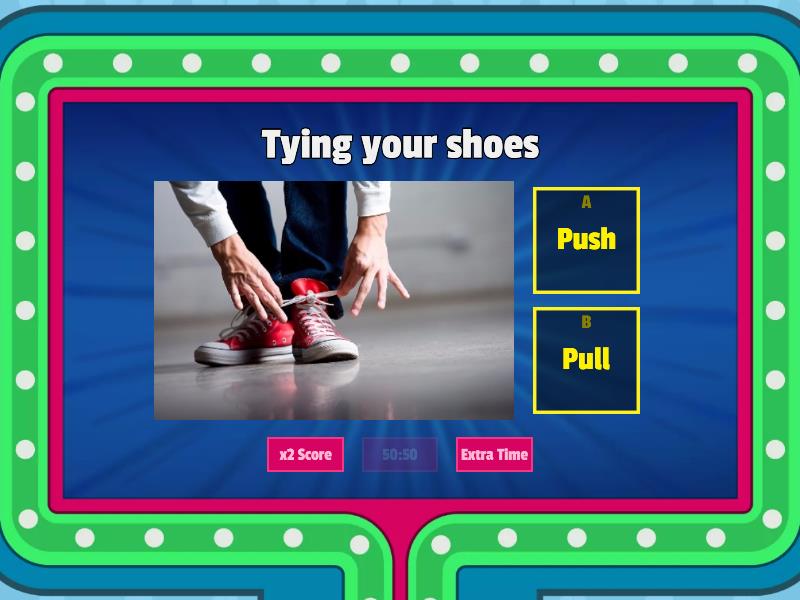1) Tying your shoes a) Push b) Pull 2) Riding a bicycle a) Push b) Pull 3) A mother helping her child to swing. a) Push b) Pull 4) Opening the door a) Push b) Pull 5) Zipping the zipper a) Push b) Pull 6) Moving the wagon a) Push b) Pull 7) Throwing a ball a) Push b) Pull 8) Opening the door a) Push b) Pull 9) Kicking a ball a) Push b) Pull 10) Playing tug of war a) Push b) Pull