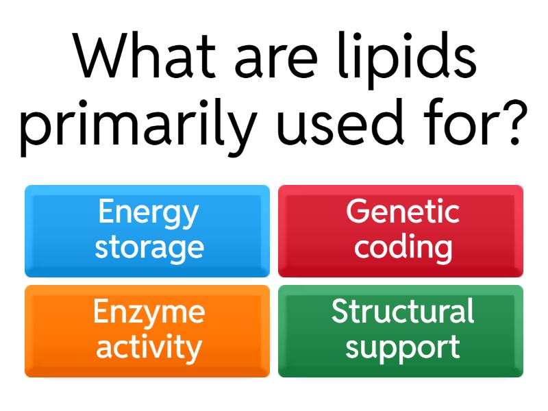 1) What are lipids primarily used for? a) Energy storage b) Genetic coding c) Enzyme activity d) Structural support 2) Which macromolecule is an enzyme? a) Protein b) Lipid c) Carbohydrate d) Nucleic acid 3) What is the monomer of proteins? a) Amino acids b) Nucleotides c) Fatty acids d) Monosaccharides 4) Which macromolecule stores genetic information? a) Nucleic acids b) Proteins c) Lipids d) Carbohydrates 5) What are carbohydrates primarily used for? a) Energy b) Insulation c) Genetic coding d) Catalysis 6) Which macromolecule forms cell membranes? a) Lipids b) Proteins c) Carbohydrates d) Nucleic acids 7) What is the main function of nucleotides? a) Genetic information b) Energy storage c) Structural support d) Insulation 8) Which macromolecule can be a hormone? a) Protein b) Carbohydrate c) Nucleic acid d) Lipid 9) What is a polysaccharide? a) Complex carbohydrate b) Simple sugar c) Protein chain d) Lipid molecule 10) Which macromolecule is not soluble in water? a) Lipids b) Proteins c) Carbohydrates d) Nucleic acids 11) What is the role of RNA? a) Protein synthesis b) Energy storage c) Cell membrane d) Insulation 12) Which macromolecule is a primary energy source? a) Carbohydrates b) Proteins c) Lipids d) Nucleic acids 13) What is a triglyceride? a) Lipid b) Protein c) Carbohydrate d) Nucleic acid 14) Which macromolecule has a double helix structure? a) DNA b) RNA c) Protein d) Lipid 15) What is the function of enzymes? a) Catalyze reactions b) Store energy c) Transport oxygen d) Provide insulation 16) Which macromolecule is involved in immune response? a) Proteins b) Lipids c) Carbohydrates d) Nucleic acids