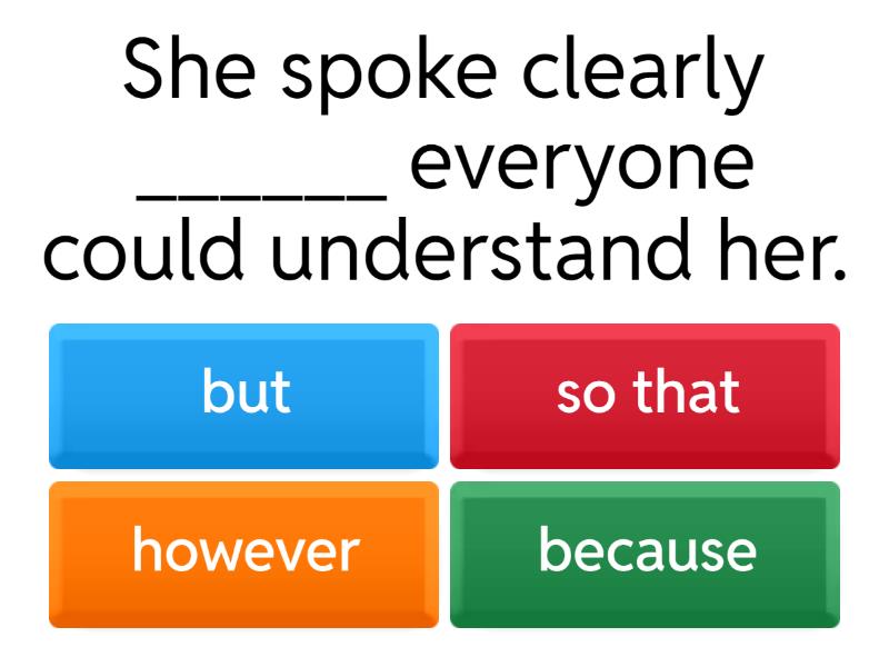 1) She spoke clearly ______ everyone could understand her. a) but b) so that c) however d) because 2) He studied hard, ______ he could pass the exam. a) so b) although c) yet d) because 3) They left early ______ catch the train. a) so that b) but c) although d) however 4) She works overtime ______ she can save money for a new car. a) so that b) although c) therefore d) but 5) I turned on the light, ______ I could read my book. a) so b) although c) however d) since 6) He wanted to lose weight; ______ he started exercising. a) therefore b) but c) although d) so that 7) The company opened new offices; ______, they wanted to expand. a) for this purpose b) but c) although d) because 8) She left the party early ______ she could rest. a) so that b) although c) however d) for 9) You must ______ study hard ______ risk failing the test. a) although / but b) either / or c) not only / but also d) since / so 10) She volunteers ______ to help others ______ to gain experience. a) not only / but also b) either / or c) although / but d) since / so 11) He repeated the instructions twice ______ everyone could understand. a) so that b) although c) however d) but 12) I need to wake up early, ______ I will set an alarm. a) so b) although c) because d) yet 13) She is studying medicine; ______, she wants to become a doctor. a) for this purpose b) but c) although d) since 14) He speaks slowly ______ his students can follow him. a) so that b) although c) however d) but 15) The teacher explained again; ______, some students still didn’t understand. a) for that reason b) but c) although d) yet 16) You can ______ stay here ______ come with us. a) neither / nor b) either / or c) not only / but also d) although / but 17) She studies hard ______ to get good grades ______ to make her parents proud. a) not only / but also b) either / or c) although / but d) so that / so 18) He worked extra hours ______ he could pay for his vacation. a) so that b) although c) but d) however 19) We must wear helmets; ______, safety is very important. a) for this reason b) but c) although d) so that 20) He trains every day ______ win the championship. a) in order to b) but c) although d) so