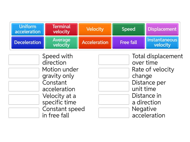 Acceleration - Rate of velocity change, Velocity - Speed with direction, Displacement - Distance in a direction, Speed - Distance per unit time, Uniform acceleration - Constant acceleration, Deceleration - Negative acceleration, Instantaneous velocity - Velocity at a specific time, Average velocity - Total displacement over time, Free fall - Motion under gravity only, Terminal velocity - Constant speed in free fall,