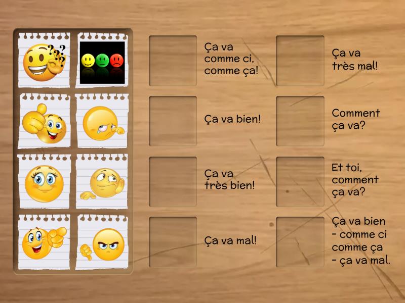 Ça va bien! , Ça va très mal!, Comment ça va?, Ça va comme ci, comme ça!, Ça va très bien!, Ça va bien - comme ci comme ça - ça va mal., Ça va mal!, Et toi, comment ça va?,