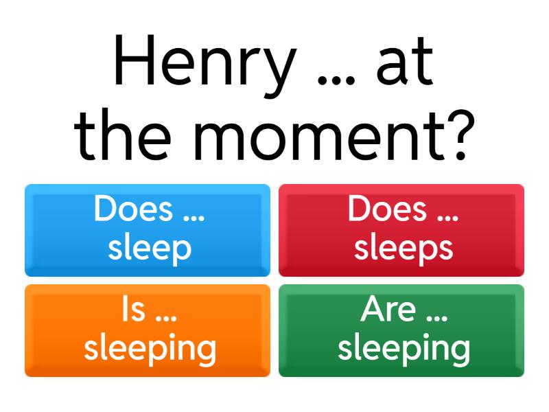 1) Henry ... at the moment? a) Does ... sleep b) Does ... sleeps c) Is ... sleeping d) Are ... sleeping 2) Sonia often ... in the choir. a) sing b) sings c) is singing d) are singing 3) I'm sorry but I can't talk to you because I ... a) work b) works c) am working d) am work 4) My best friend ... meat. She's a vegetarian. a) not eating b) isn't eating c) isn't eat d) doesn't eat 5) Today my son ... to San Francisco. a) is flying b) flies c) fly d) flying 6) Shh! Dad and brother ... the news. a) watches b) is watching c) are watching d) watching 7) Look who ...? a) are talking b) talk c) talks d) is talking 8) I ... a bike every day. Only at weekends. a) don't ride b) doesn't ride c) am not riding d) isn’t ride 9) Hurry! The bus ... . I ... to miss it. a) is coming, don't want b) is coming, am not wanting c) comes, don't want d) comes, am not wanting 10) ... it ever ... in India? a) Do .. snowing b) Does ... snows c) Does ... snow d) Is ... snowing 11) You very often ... your keys. a) loses b) lose c) is losing d) losing