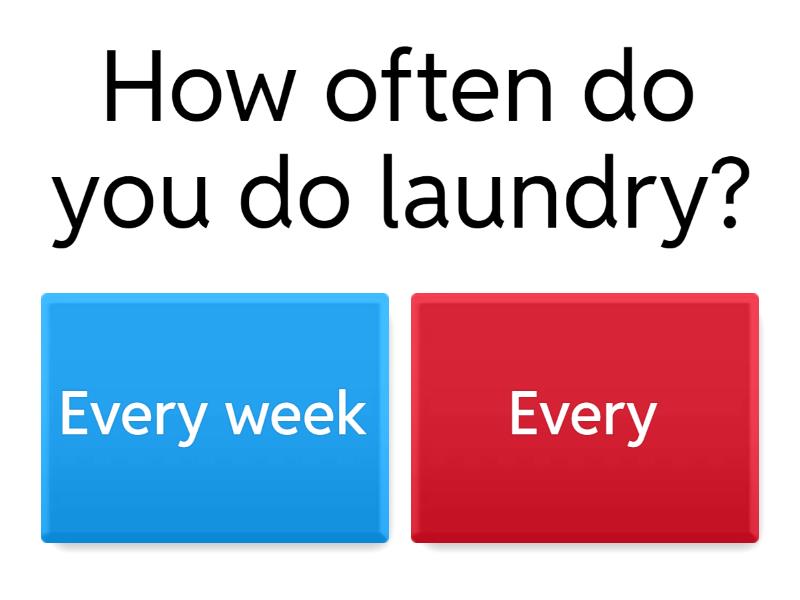 1) How often do you do laundry? a) Every week b) Every 2) How often do you go to class? a) Two b) Twice a week 3) She ______ eats breakfast before work. a) usually b) twice 4) They _______ study on the weekend. a) always b) once a week 5) _______ he eats chicken for dinner. a) Sometimes b) Never 6) He ________ goes shopping at that store. a) rarely b) twice 7) We ________ drink coffee in the morning. a) every b) always 8) We _________ drink coffee in the morning. a) twice b) never 9) _________ often do you cook at home? a) What b) How 10) How often do you bake cookies? a) Every month b) Every