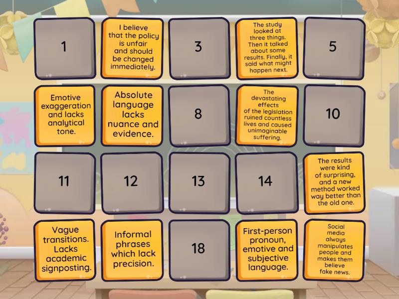 Informal phrases which lack precision. - The results were kind of surprising, and a new method worked way better than the old one., First-person pronoun, emotive and subjective language. - I believe that the policy is unfair and should be changed immediately. , Emotive exaggeration and lacks analytical tone. - The devastating effects of the legislation ruined countless lives and caused unimaginable suffering. , Absolute language lacks nuance and evidence. - Social media always manipulates people and makes them believe fake news. , Vague transitions. Lacks academic signposting. - The study looked at three things. Then it talked about some results. Finally, it said what might happen next. , Contractions resulting in an informal tone. - The experiment didn't go as planned, but it's still useful for future research. , Vague nouns and unclear purpose. - Stuff was collected from different places and analysed to see what was going on. , Weak connective (but), could be improved with 'however' or 'nevertheless'. - The results were interesting, but the sample size was small. , Digit under 10 used numerically. - 5 participants dropped out of the study due to illness, Wordy phrasing. Could be more concise. - Due to the fact that the experiement was conducted in a laboratory setting, it can be said that the results are somewhat reliable. ,