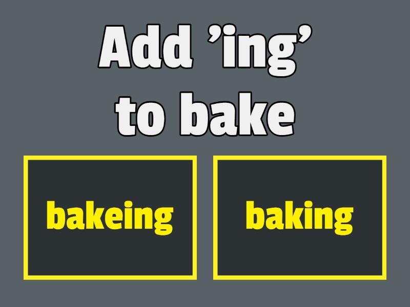 1) Add 'ing' to bake a) bakeing b) baking 2) Add 'ing' to jump a) jumping b) jumpping 3) Add 'ing' to skip a) skiping b) skipping 4) Add 'ing' to dance a) danceing b) dancing 5) Add 'ing' to ride a) riding b) rideing 6) Add 'ing' to hop a) hoping b) hopping 7) Add 'ing' to wave a) waveing b) waving 8) Add 'ing' to race a) racing b) raceing 9) Add 'ing' to walk a) walking b) walkking 10) Add 'ing' to chase a) chaseing b) chasing