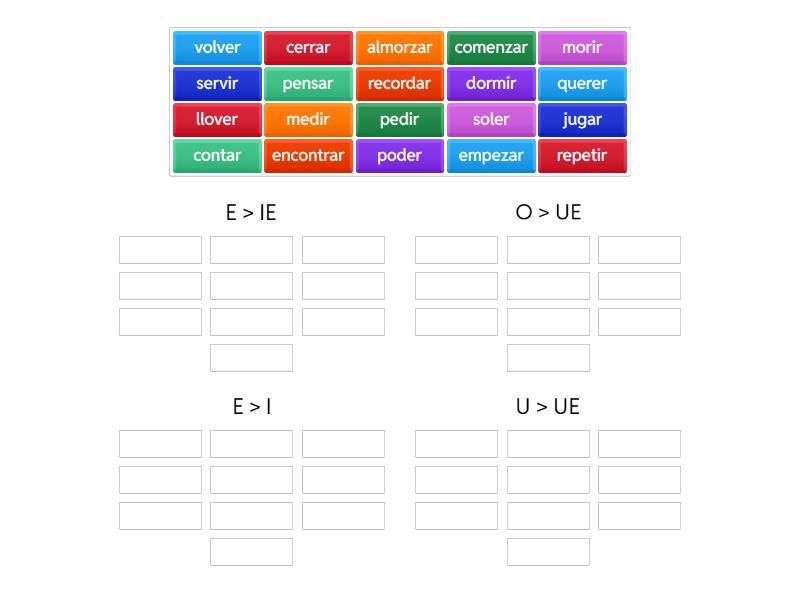E > IE: cerrar, comenzar, empezar, pensar, querer, O > UE: contar, encontrar, llover, morir, recordar, volver, dormir, soler, almorzar, poder, E > I: repetir, pedir, servir, medir, U > UE: jugar,