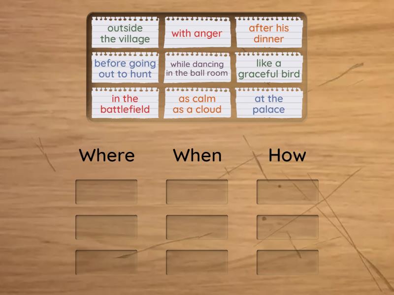 Where: in the battlefield, at the palace, outside the village, When: after his dinner, before going out to hunt, while dancing in the ball room, How: like a graceful bird, with anger, as calm as a cloud,