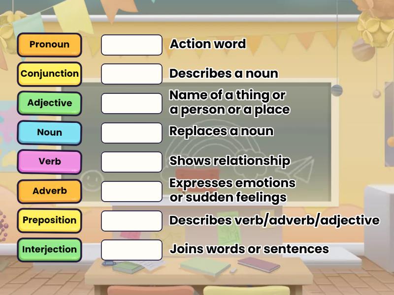 Noun - Name of a thing or a person or a place, Pronoun - Replaces a noun, Verb - Action word, Adjective - Describes a noun, Adverb - Describes verb/adverb/adjective, Preposition - Shows relationship, Conjunction - Joins words or sentences, Interjection - Expresses emotions or sudden feelings,