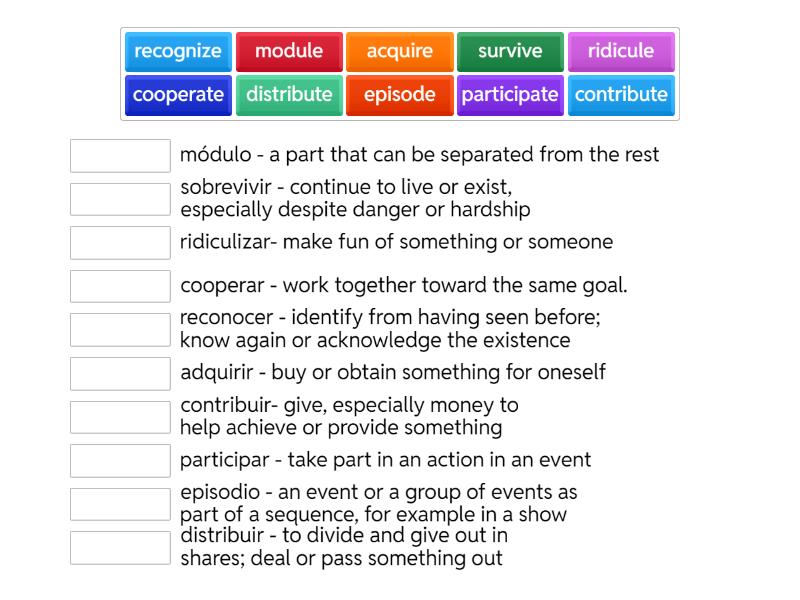 contribute - contribuir- give, especially money to help achieve or provide something, ridicule - ridiculizar- make fun of something or someone, distribute - distribuir - to divide and give out in shares; deal or pass something out, module - módulo - a part that can be separated from the rest, episode - episodio - an event or a group of events as part of a sequence, for example in a show, cooperate - cooperar - work together toward the same goal., participate - participar - take part in an action in an event, survive - sobrevivir - continue to live or exist, especially despite danger or hardship, acquire - adquirir - buy or obtain something for oneself, recognize - reconocer - identify from having seen before; know again or acknowledge the existence,