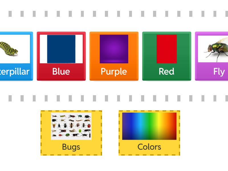 Bugs: Bee, Fly, Ant, Beetle, Caterpillar, Colors: Red, Blue, Yellow, Green, Purple,