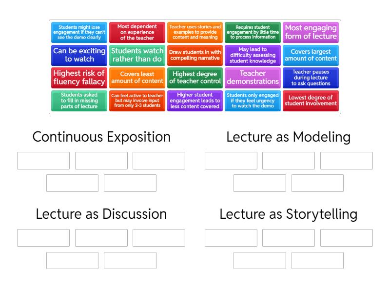 Continuous Exposition: Lowest degree of student involvement, May lead to difficulty assessing student knowledge, Covers largest amount of content, Highest degree of teacher control, Highest risk of fluency fallacy, Lecture as Modeling: Teacher demonstrations, Students only engaged if they feel urgency to watch the demo, Students watch rather than do, Students might lose engagement if they can't see the demo clearly, Can be exciting to watch, Lecture as Discussion: Requires student engagement by little time to process information, Higher student engagement leads to less content covered, Students asked to fill in missing parts of lecture, Teacher pauses during lecture to ask questions, Can feel active to teacher but may involve input from only 2-3 students, Lecture as Storytelling: Covers least amount of content, Teacher uses stories and examples to provide content and meaning, Most dependent on experience of the teacher, Draw students in with compelling narrative, Most engaging form of lecture,
