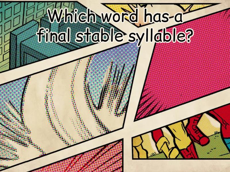 1) Which word has a final stable syllable? a) table b) run c) cat d) dog 2) Which word has a final stable syllable? a) not b) cable c) sun d) bat 3) Which word has a final stable syllable? a) bubble b) hat c) pat d) car 4) Which word has a final stable syllable? a) purple b) take c) fan d) cup 5) Which word has a final stable syllable? a) candle b) map c) dog d) cap 6) Which word has a final stable syllable? a) jungle b) top c) mat d) log 7) Which word has a final stable syllable? a) puzzle b) bag c) net d) tag 8) Which word has a final stable syllable? a) giggle b) pot c) bat d) lid 9) Which word has a final stable syllable? a) pickle b) rug c) pen d) box 10) Which word has a final stable syllable? a) turtle b) cat c) bat d) hat