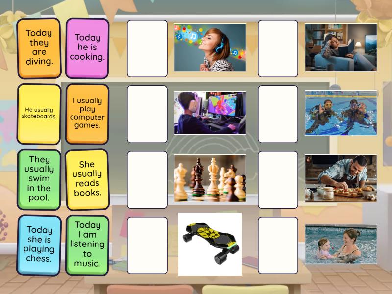 I usually play computer games., Today I am listening to music., She usually reads books., Today she is playing chess., He usually skateboards., Today he is cooking., They usually swim in the pool., Today they are diving.,
