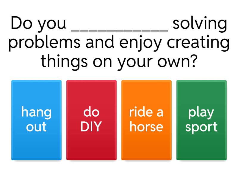 1) Do you ___________ solving problems and enjoy creating things on your own? a) hang out b) do DIY c) ride a horse d) play sport 2) If you have some ___________, you might want to consider joining a judo club. a) free time b) creativity c) paper flowers d) hanging out 3) Are you ___________ learning new things about information technology? a) fond of b) keen on c) interested in d) not into 4) Some people find ___________ a great way to relax and be creative. a) building doll houses b) going to the cinema c) playing sports d) watching cartoons 5) If you enjoy physical activity, you might want to try ___________. a) knitting b) surfing the net c) riding a horse d) making paper flowers 6) Do you ___________ spending time outdoors and exploring new places? a) go to the museum b) go cycling c) see new exhibits d) hang out 7) For a fun and challenging ___________, consider joining a puzzle club. a) DIY activity b) judo club c) comedy d) snowboard 8) If you want to improve your ___________, try learning something about IT. a) cooking skills b) computer skills c) paper folding skills d) knitting skills 9) Some people find that doing puzzles is a great ___________. a) mental exercise b) physical health c) creativity d) invitation 10) If you're ___________ photography, you might want to take up a photography class. a) not into b) crazy about c) interested in d) fond of 11) Would you prefer to spend your ___________ watching a comedy or a drama? a) leisure time b) free time c) hanging out d) detesting time 12) If you're passionate about animals, you should avoid activities that ___________ them. a) harm b) invite c) balance d) reduce stress 13) Enjoying a DIY activity like making a ___________ can be a rewarding experience. a) bracelet b) snowboard c) pumpkin soup d) model 14) Are you someone who likes to ___________ with friends regularly? a) play sports b) message friends c) go cycling d) ride a horse 15) For those who are ___________ in history and art, visiting a museum is a great idea. a) keen on b) crazy about c) not into d) interested in 16) If you're looking to improve your ___________, consider joining a cooking class. a) balance b) muscle c) strength d) chef 17) If you enjoy physical challenges and love the snow, you might want to try ___________. a) building doll houses b) making paper flowers c) snowboarding d) surfing the net 18) People who ___________ usually find joy in creating things from scratch. a) detest b) harm c) enjoy d) hurt 19) Joining a ___________ is a great way to meet new people who share similar interests. a) judo club b) knitting kit c) puzzle club d) cinema 20) Those who enjoy a good laugh might choose to ___________ watching a comedy show. a) go to the cinema b) hang out c) build doll houses d) hurt animals