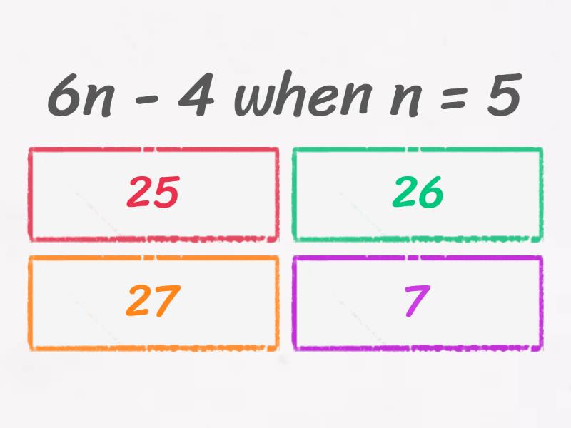 1) 6n - 4 when n = 5 a) 26 b) 27 c) 25 d) 7 2) 7r2 when r = 3 a) 441 b) 42 c) 63 d) 14 3) 9 + 7b when b = 4 a) 64 b) 83 c) 37 d) 16 4) 8z + 9 when z = 5 a) 94 b) 49 c) 17 d) 54 5) 5h - 4z when h = 1 and z = 2 a) 3 b) 1 c) 6 d) -3 6) x2 + y when x = 4 and y = 5 a) 13 b) 29 c) 21 d) 81 7) 8a - b2 when a = 2 and b = 1 a) 15 b) 81 c) 14 d) 4 8) xy - 9 when x = 2 and y = 4 a) 17 b) -17 c) -1 d) 1 9) xy - 9 when x = -2 and y = 1/2 a) 33 b) -10 c) 15 d) -1 10) 9f + 3g when f = 3 and g = 2 a) 99 b) 33 c) 59 d) 125 11) c - 9 when c = 16 a) 25 b) 8 c) 20 d) 7 12) Given the expression 6n2 - 10n + 2, name the number that represents a CONSTANT. a) n2 b) 6 c) 10 d) 2 13) Given the expression 6n2 - 10n + 2, name the number that represents a COEFFICIENT. a) n2 b) 6 c) -10 d) 2 14) -8c - 9 when c = -3 a) 25 b) 8 c) 20 d) 15 15) 4y - 5 when y = 6 a) 19 b) 24 c) 29 d) 21 16) n2 + 7 when n = 3 a) 13 b) 16 c) 9 d) 15 17) 4m2 - 5n when m = -3 and n= -1 a) 1 b) 49 c) 41 d) 7 18) In the expression 10x - 6y + 3y - 11, -6y and 3y are considered to be... a) constants b) like terms c) coefficients d) equations 19) In the expression -5x + 8y - 39, -5 and 8 are considered to be... a) constants b) like terms c) coefficients d) equations 20) In the expression -5x + 8y - 39, -39 is considered to be a... a) constant b) like terms c) coefficients d) equations