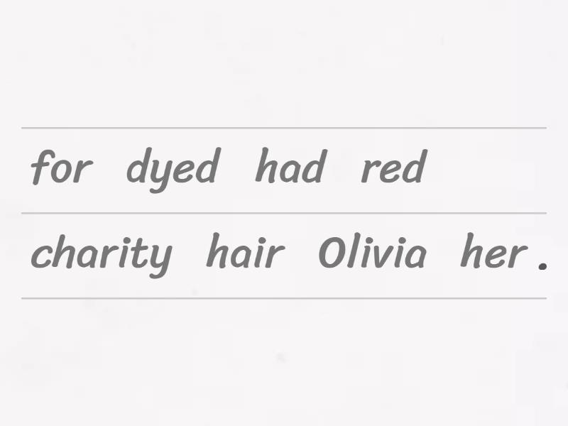 Olivia had her hair dyed red for charity. , Josh had his bike stolen at the weekend. , The house had its roof blown off in the storm. , We had the carpets cleaned after the party last weekend. , My sister always has her nails done on Fridays. , She had her visa application refused last month. ,
