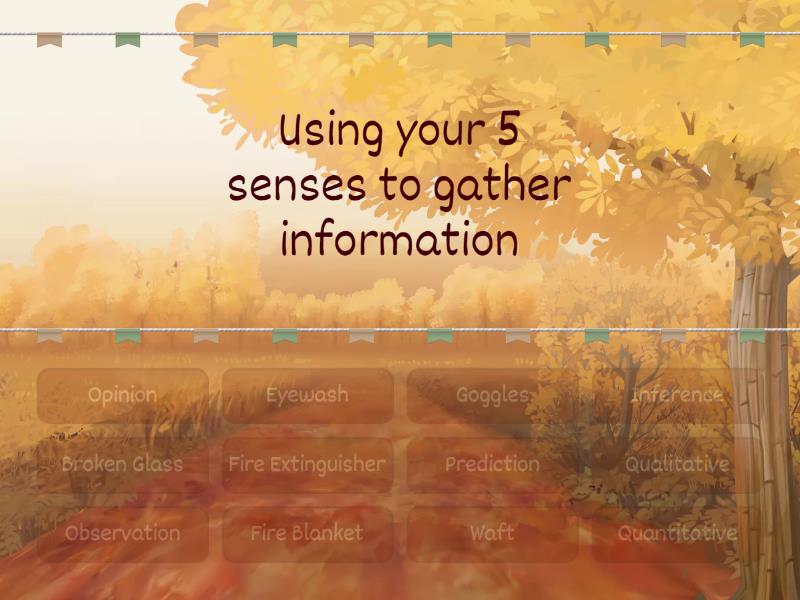 Observation - Using your 5 senses to gather information, Qualitative - Data that describes using words, Quantitative - Data that counts or measures with numbers, Inference - A guess about something based on your observations, Opinion - How you feel about something, Prediction - A guess about the future, Eyewash - Used to clean unwanted things out of your eyes, Goggles - Worn when using chemicals, glass or heat., Fire Blanket - Can be used by students in a fire emergency., Fire Extinguisher - Will be used in emergencies by the teacher., Broken Glass - Should never be touched by a student. Get a teacher., Waft - The safe way to smell something in the lab,