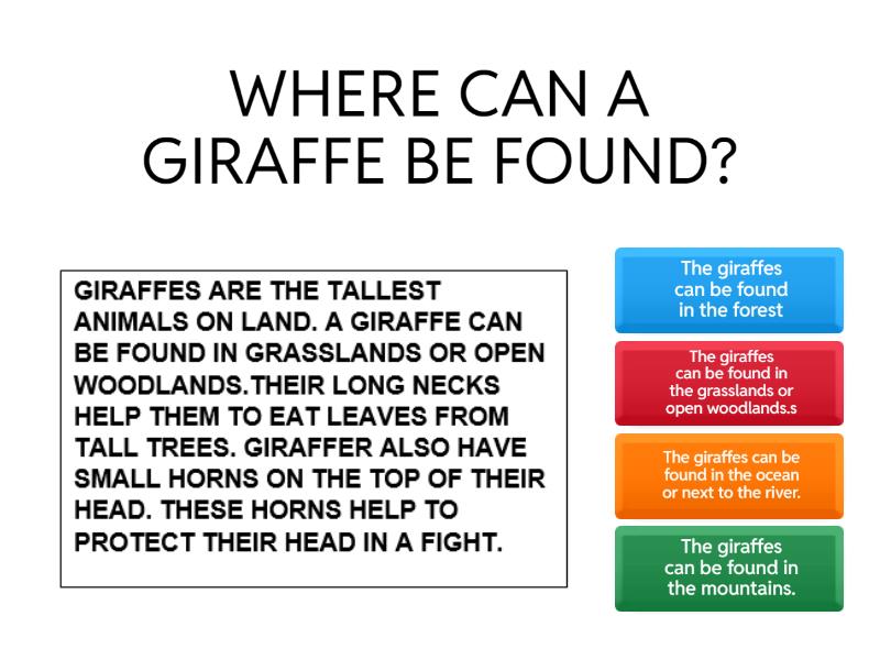 1) WHERE CAN A GIRAFFE BE FOUND? a) The giraffes can be found in the forest b) The giraffes can be found in the grasslands or open woodlands.s c) The giraffes can be found in the ocean or next to the river. d) The giraffes can be found in the mountains. 2) WHY ARE THEIR LONG NECKS IMPORTANT? a) Their long neck help them to eat from tall trees b) Their long necks help them to wear neckless c) Their long neck is useful to swing from one tree to another 3) WHY DO GIRAFFES HAVE HORNS? a) they help to protect if they need to fight b) They make them look beautiful c) it's good to prevent rain. 4) WHAT DO THEY DO IN THE AFTERNOON? a) THEY GIVE THEIR PETS A BATH b) THEY PLAY WITH THEM IN THE PARK c) THEY FEED THEIR PETS d) THEY CLEAN THEIR SPACE 5) ANNA'S CAT IS NAMED... a) MILO b) DENIS c) PEPI d) BUDDY 6) EVERY MORNING, THEY... a) FEED THEIR PETS AND PLAY OUTSIDE b) FEED THEIR PETS AND TAKE THEM FOR A WALK c) PLAY WITH THE PETS AND GIVE THEM A BATH