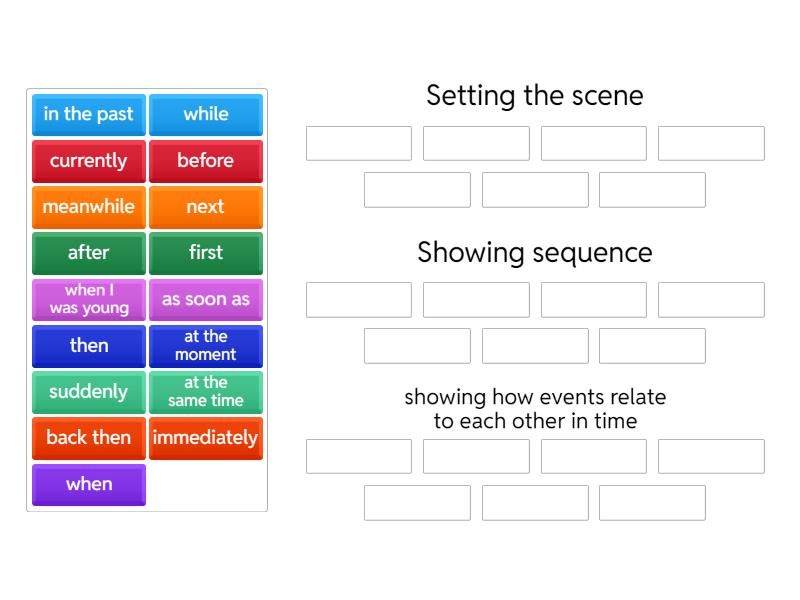 Setting the scene: currently, at the moment, in the past, when I was young, back then, Showing sequence: first, next, then, before, after, showing how events relate to each other in time: as soon as, when, immediately, suddenly, while, meanwhile, at the same time,