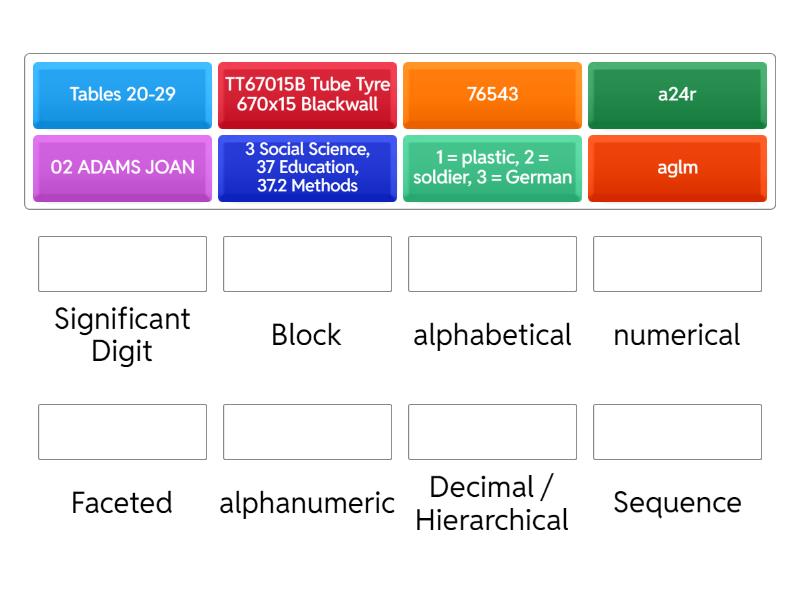 aglm - alphabetical, 76543 - numerical, a24r - alphanumeric, 02 ADAMS JOAN - Sequence, Tables 20-29 - Block, TT67015B Tube Tyre 670x15 Blackwall - Significant Digit, 1 = plastic, 2 = soldier, 3 = German - Faceted, 3 Social Science, 37 Education, 37.2 Methods - Decimal / Hierarchical,