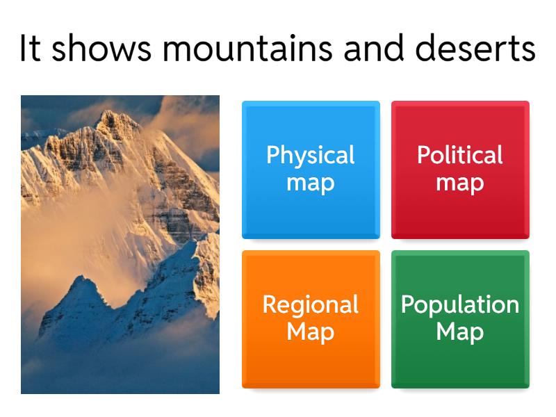 1) It shows mountains and deserts a) Physical map b) Political map c) Regional Map d) Population Map 2) It shows major cities and capital cities a) Physical map b) Political map c) Regional Map d) Population Map 3) It shows the borders between different countries a) Physical Map b) Political Map c) Regional Map d) Population Map 4) It shows the differnt regions in the United States a) Physical Map b) Political Map c) Regional Map d) Population Map 5) It shows bodies of water and landforms a) Physical map b) Political map c) Regional Map d) Population Map 6) What type of map shows people in an area? a) Physical Map b) Political Map c) Regional Map d) Population Map 7) What type of map shows elevation? a) Physical Map b) Political Map c) Regional Map d) Population Map 8) What type of map shows storms? a) Physical Map b) Population Map c) Weather Map d) Political Map