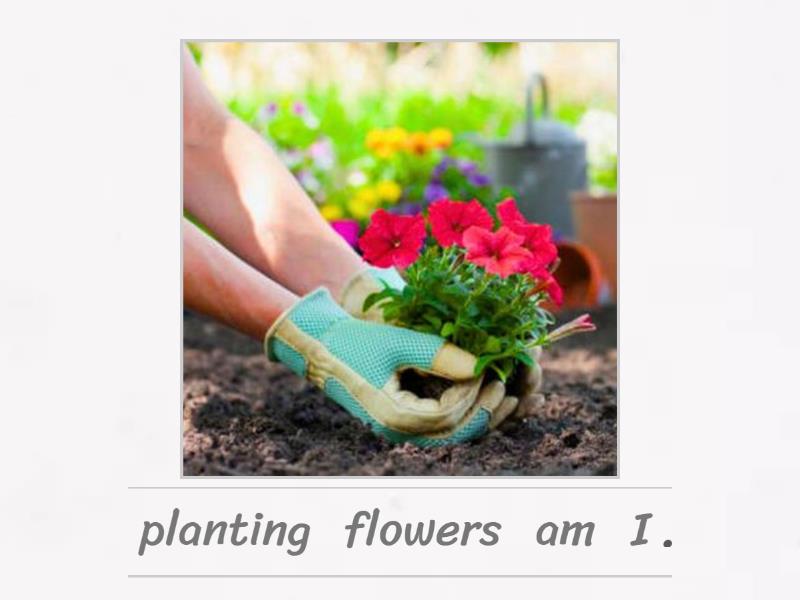 I am planting flowers., My sister is watching TV in the living room., The children are reading a book , I am cooking dinner., Is your brother driving ?, She's listening to music in the bedroom., Shssss! The baby is sleeping., We are swimming in the pool today., We are cooking rice and beans now., My brother is playing the piano right now.,
