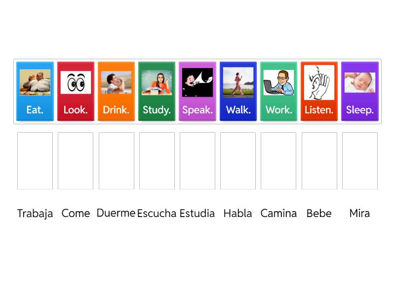 Eat. - Come, Sleep. - Duerme, Speak. - Habla, Drink. - Bebe, Work. - Trabaja, Study. - Estudia, Listen. - Escucha, Look. - Mira, Walk. - Camina,