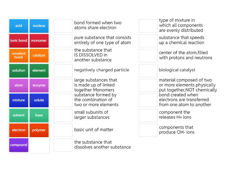 atom - basic unit of matter, compound - substance formed by the combination of two or more elements, solvent - the substance that dissolves another substance, acid - component the releases H+ ions, covalent bond - bond formed when two atoms share electron, element - pure substance that consists entirely of one type of atom, enzyme - biological catalyst, nucleus - center of the atom,filled with protons and neutrons, base - components that produce OH- ions, monomer - small subunits of larger substances, ionic bond - bond created when electrons are transferred from one atom to another, catalyst - substance that speeds up a chemical reaction, polymer - large substances that is made up of linked together Monomers, solution - type of mixture in which all components are evenly distributed, mixture - material composed of two or more elements physically put together,NOT chemically, electron - negatively charged particle, solute - the substance that IS DISSOLVED in another substance,