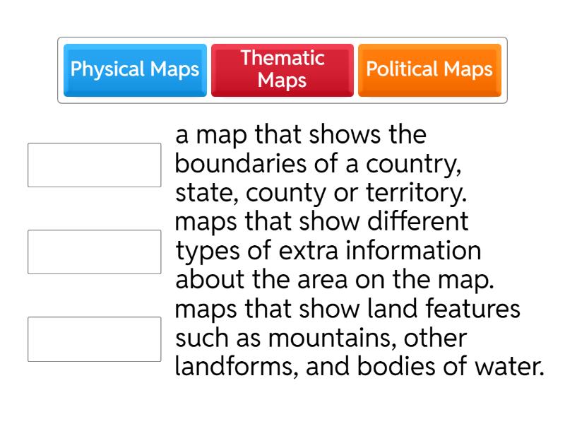 Physical Maps - maps that show land features such as mountains, other landforms, and bodies of water., Political Maps - a map that shows the boundaries of a country, state, county or territory., Thematic Maps - maps that show different types of extra information about the area on the map.,
