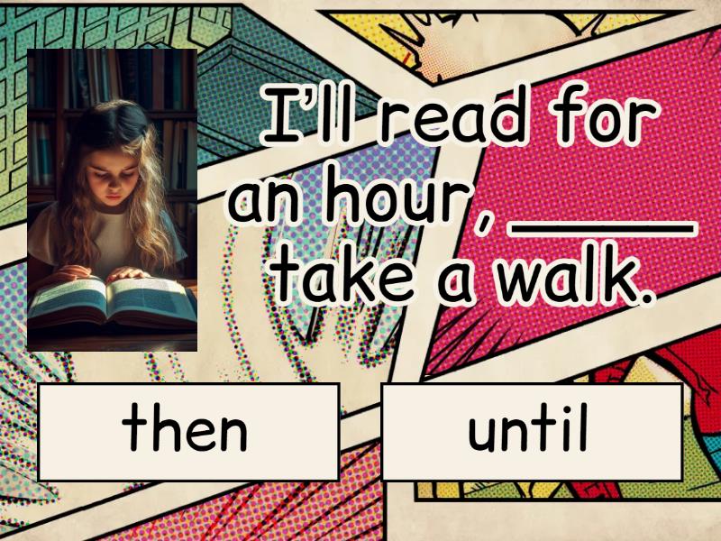 1) I’ll read for an hour, ____ take a walk. a) then b) until 2) He reads ____ midnight every night. a) as soon as b) until 3) Jake was 4 years old ____ he started to read. a) when b) until 4) ____ I finish this book, I’ll write a review. a) until b) after 5) Mary started reading "Miss Marple" ____ she finished "Hercule Poirot". a) then b) as soon as