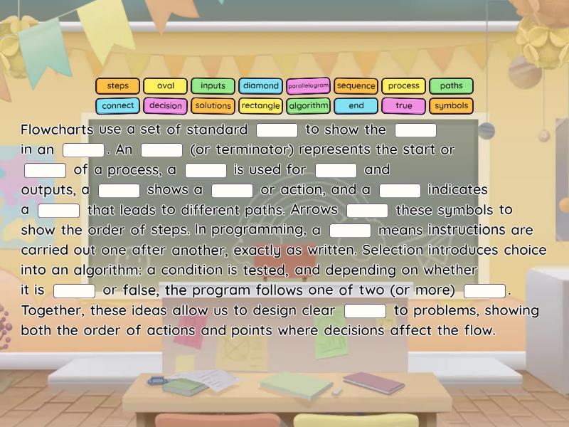 Flowcharts use a set of standard ____ to show the ____ in an ____. An ____ (or terminator) represents the start or ____ of a process, a ____ is used for ____ and outputs, a ____ shows a ____ or action, and a ____ indicates a ____ that leads to different paths. Arrows ____ these symbols to show the order of steps. In programming, a ____ means instructions are carried out one after another, exactly as written. Selection introduces choice into an algorithm: a condition is tested, and depending on whether it is ____ or false, the program follows one of two (or more) ____. Together, these ideas allow us to design clear ____ to problems, showing both the order of actions and points where decisions affect the flow.