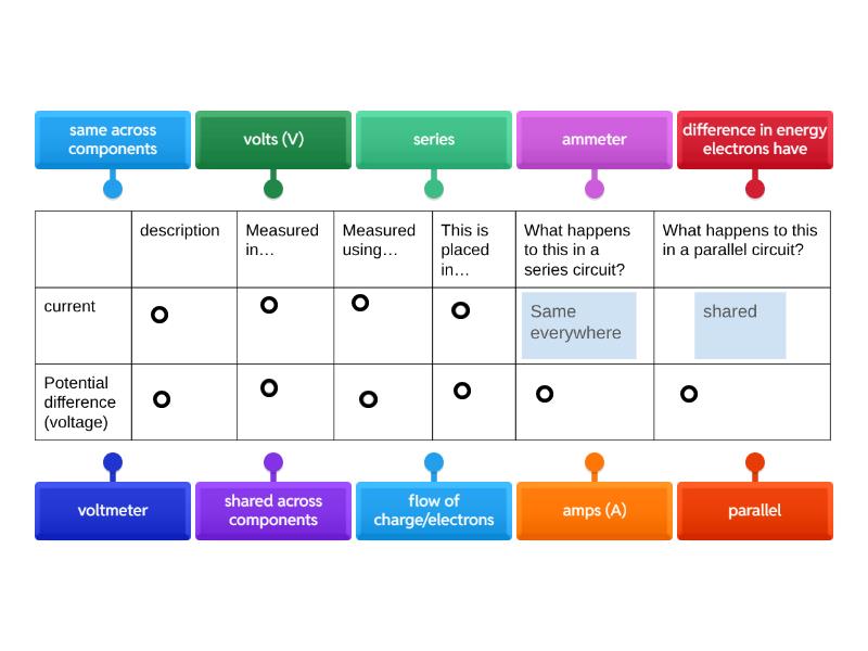 flow of charge/electrons, difference in energy electrons have, amps (A), volts (V), ammeter, voltmeter, series, parallel, shared across components, same across components.