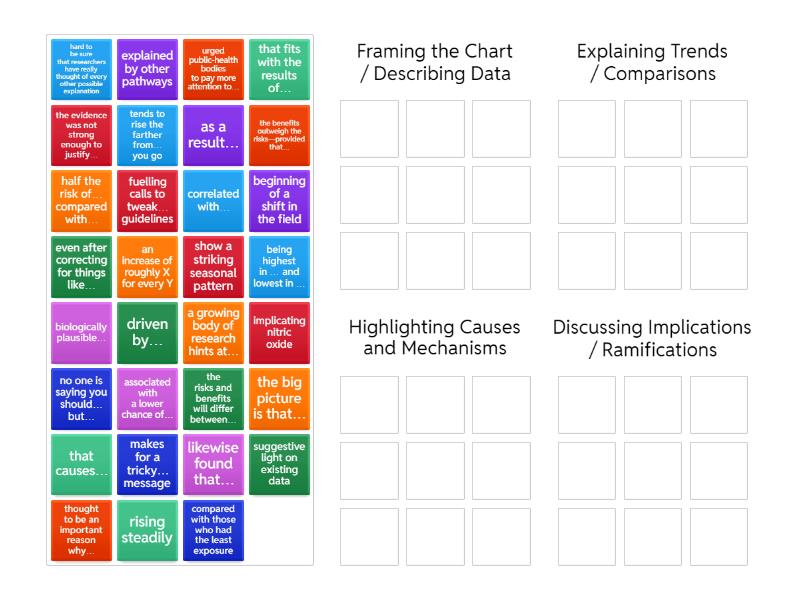 Framing the Chart / Describing Data: the big picture is that…, a growing body of research hints at…, that fits with the results of…, likewise found that…, associated with a lower chance of…, correlated with…, even after correcting for things like…, the evidence was not strong enough to justify…, biologically plausible…, Explaining Trends / Comparisons: rising steadily, show a striking seasonal pattern, being highest in … and lowest in …, tends to rise the farther from… you go, an increase of roughly X for every Y, compared with those who had the least exposure, half the risk of… compared with…, Highlighting Causes and Mechanisms: as a result…, that causes…, driven by…, explained by other pathways, thought to be an important reason why…, implicating nitric oxide, suggestive light on existing data, Discussing Implications / Ramifications: the benefits outweigh the risks—provided that…, urged public-health bodies to pay more attention to…, fuelling calls to tweak… guidelines, hard to be sure that researchers have really thought of every other possible explanation, no one is saying you should… but…, the risks and benefits will differ between…, makes for a tricky… message, beginning of a shift in the field,