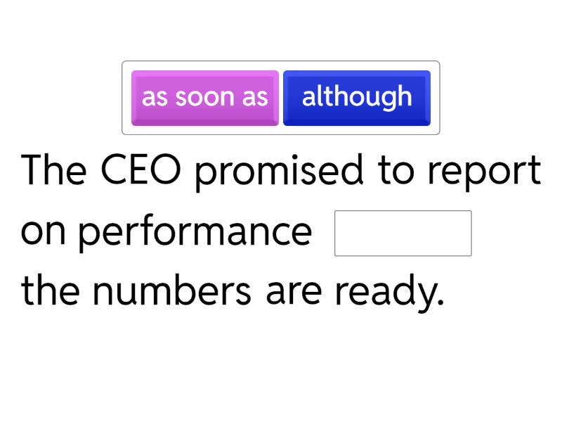 ____ we rejected the proposal, the client still wants to negotiate. ____ the manager set priorities, the team didn’t follow them. We can’t close the deal ____ both sides agree on the terms. She waited ____ the team summarized the discussion before giving her opinion. Please confirm the details ____ we sign the contract. We always review the progress ____ presenting results to the board. The company approved the budget ____ a long debate. He raised a question ____ the manager finished her presentation. ____ clients ask for clarification, we respond in writing. We update the plan ____ the team finds a solution to a new problem. We’ll start the meeting ____ the director arrives. The CEO promised to report on performance ____ the numbers are ready. ____ we missed the deadline, we had to offer a discount. The board decided to renegotiate the contract ____ market conditions have changed. We have monitored the results ____ the new system was introduced. The company has achieved its goals ____ the merger last year. ____ he handled the objections well, the deal was not closed. ____ we discussed the terms, no final decision was made. ____ the team met the deadline, the quality was lower than expected. ____ the partners signed an agreement, there are still some doubts.