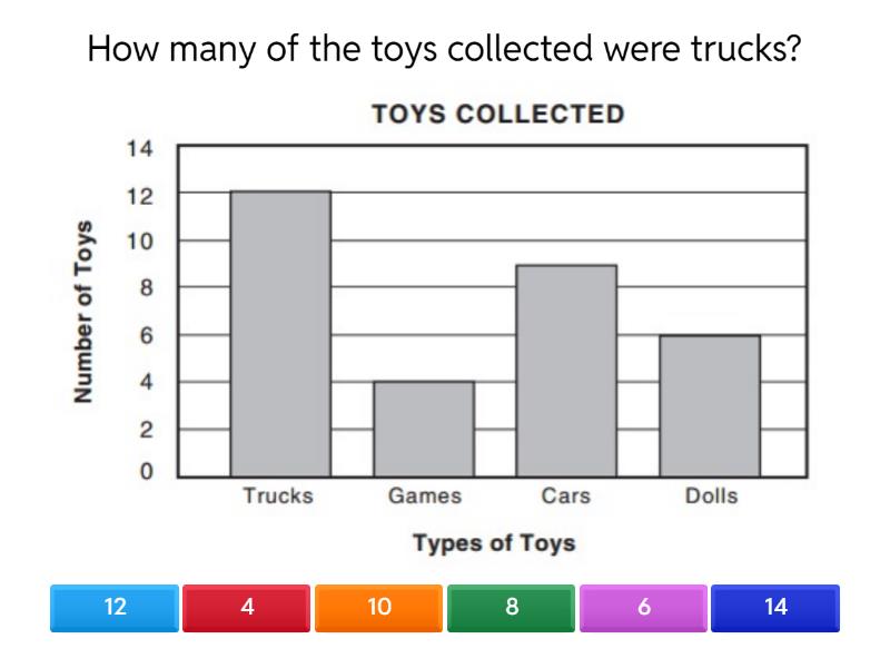 1) How many of the toys collected were trucks? a) 12 b) 4 c) 10 d) 8 e) 6 f) 14 2) How many of the toys collected were dolls? a) 12 b) 7 c) 5 d) 8 e) 6 f) 14 3) How many of the toys collected were games? a) 12 b) 4 c) 10 d) 8 e) 6 f) 14 4) How many of the toys collected were cars? a) 11 b) 7 c) 10 d) 8 e) 6 f) 9 5) What is the scale of the bar graph? (How much does each tick mark go up by) a) 1 b) 2 c) 3 d) 4 e) 5 f) 10 6) What is half of 2? a) 1 b) 2 c) 4 d) 6 e) 14 f) 10 7) How many kids said pasta was their favorite food? a) 40 b) 50 c) 35 d) 20 e) 25 f) 30 8) How many kids said pizza was their favorite food? a) 40 b) 50 c) 35 d) 20 e) 25 f) 30 9) How many kids said fries was their favorite food? a) 40 b) 50 c) 35 d) 20 e) 25 f) 30 10) How many kids said salad was their favorite food? a) 15 b) 12 c) 35 d) 20 e) 25 f) 30 11) How many kids said chicken nuggets were their favorite food? a) 40 b) 32 c) 35 d) 20 e) 25 f) 30 12) How many kids said wraps were their favorite food? a) 15 b) 12 c) 35 d) 20 e) 25 f) 30 13) How many kids in total were asked about their favorite food? a) 50 b) 180 c) 185 d) 205 e) 200 f) 195 14) What is the scale of the bar graph? (How much does each tick mark go up by) a) 50 b) 10 c) 2 d) 1 e) 5 f) 15 15) What is half of 10? a) 2 b) 20 c) 3 d) 1 e) 5 f) 4