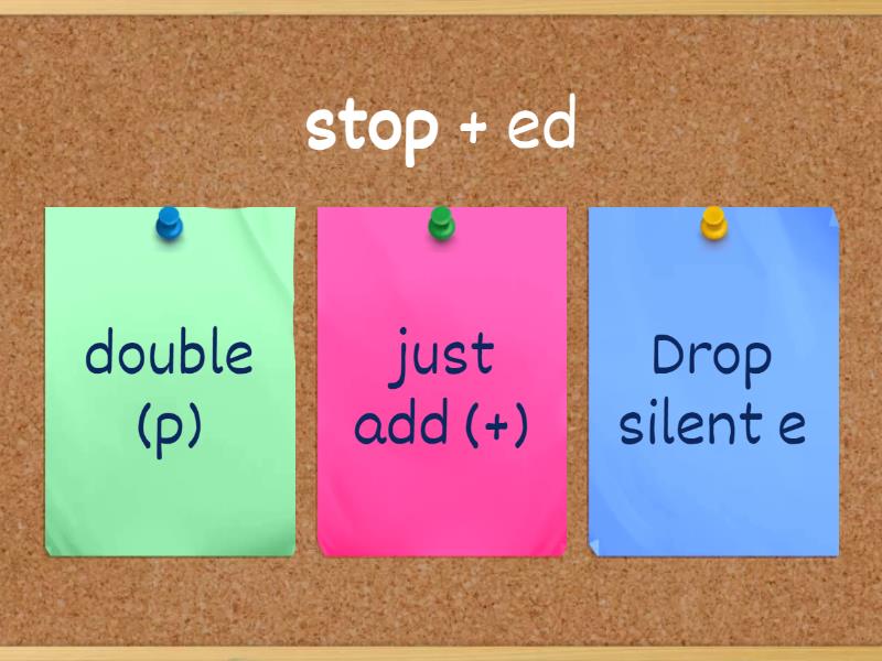 1) stop + ed   a) double (p) b) just add (+) c) Drop silent e 2) chat + ing   a) double (t) b) just add (+) c) Drop silent e 3) sink +ing   a) double (k) b) just add (+) c) Drop silent e 4) flip + ing   a) double (p) b) just add (+) c) Drop silent e 5) aim + ing   a) double (m) b) just add (+) c) Drop silent e 6) kick + ed   a) double (k) b) just add (+) c) Drop silent e 7) wax + ing a) double (x) b) just add (+) c) Drop silent e 8) join + ing a) double (n) b) just add (+) c) Drop silent e 9) pause + ing a) double (s) b) just add (+) c) Drop silent e 10) swim + ing a) double (m) b) just add (+) c) Drop silent e 11) hunt + ed  a) double (t) b) just add (+) c) Drop silent e 12) sleep + ing a) double (p) b) just add (+) c) Drop silent e 13) bake + ed a) double (k) b) just add (+) c) Drop silent e 14) drill + ed a) double (l) b) just add (+) c) Drop silent e 15) skip + ing a) double (p) b) just add (+) c) Drop silent e 16) trap + ed a) double (p) b) just add (+) c) Drop silent e 17) tape + ing a) double (e) b) just add (+) c) Drop silent e 18) talk + ed a) double (k) b) just add (+) c) Drop silent e 19) face + ing a) double (c) b) just add (+) c) Drop silent e 20) watch + ing a) double (h) b) just add (+) c) Drop silent e 21) love + ing a) double (e) b) just add (+) c) Drop silent e 22) eat + ing a) double (t) b) just add (+) c) Drop silent e 23) map + ed a) double (p) b) just add (+) c) Drop silent e 24) drip + ing a) double (p) b) just add (+) c) Drop silent e 25) pipe + ing a) double (e) b) just add (+) c) Drop silent e 26) drive + ing a) double (e) b) just add (+) c) Drop silent e 27) bike + ing a) double (e) b) just add (+) c) Drop silent e